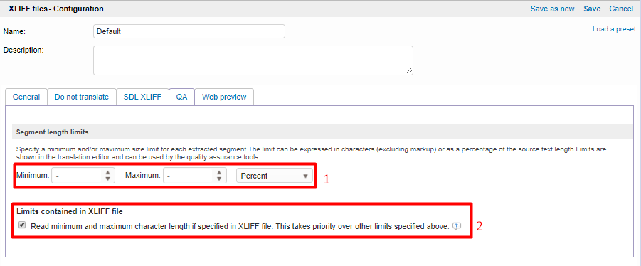 2) Limit is available in the XLIFF file: this option reads minimum and maximum character length if specified in XLIFF file. This setting overrides the selection of the previous setting.