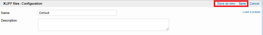 Step 3: You will need to save the change to the chosen XLIFF configuration. If you are editing a configuration other than the Default, simply click on Save. Otherwise, enter a Name and Description for the new configuration and then click on Save as new in the upper right corner of the screen.