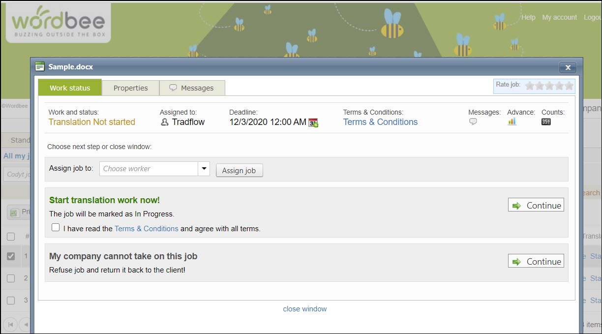 Start translation work now. If you want to accept the job yourself, first read and accept the Terms and Conditions, and then click on Continue.