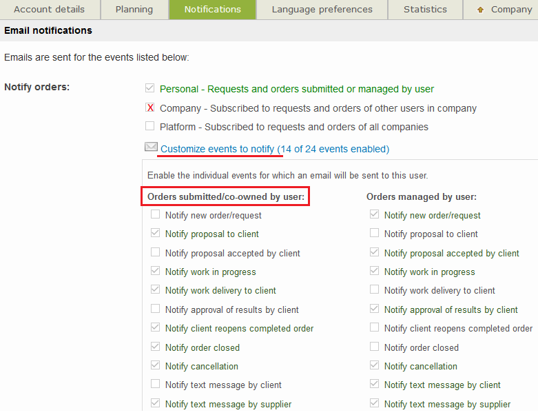 In order not to miss any emails, enable your notifications when you are co-owner of an order. Go to My account > Notification to customize all the events for which you want to be notified, even as a co-owner.