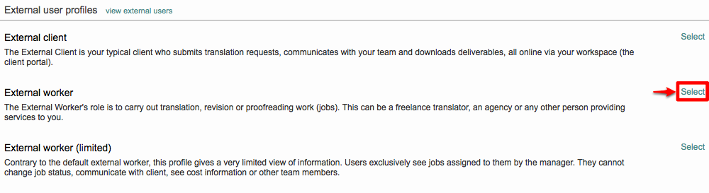 Step 3: Go the External Worker Profile (or other profile if different) and click on Select to view its details.