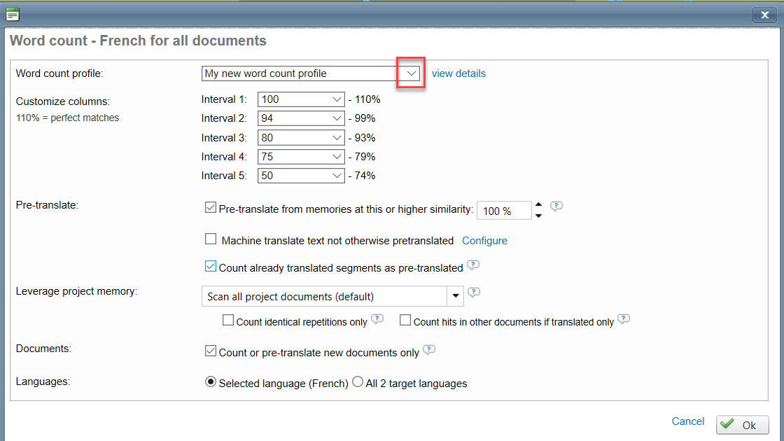 Step 3. A new window will popup displaying the settings of the word count profile. By default, Wordbee applies the first word count profile that appears on top of the drop-down list.
