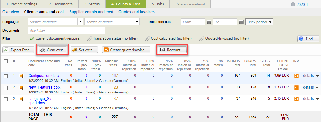 If you need to generate accurate word count analyses for quoting and invoicing purposes, it is important that you take into account the changes at the cost and pre-translation levels.