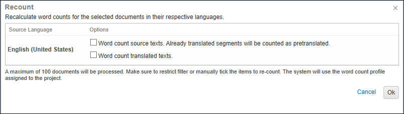 Once you select the preferred option, Wordbee will recalculate the word counts for the selected documents in their respective languages.