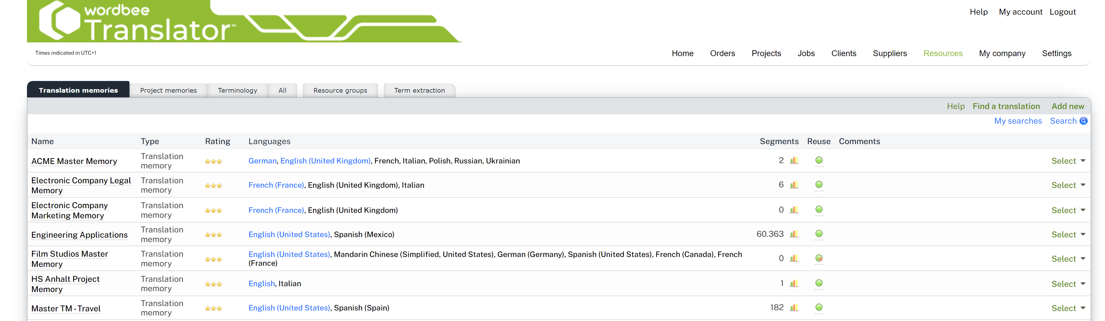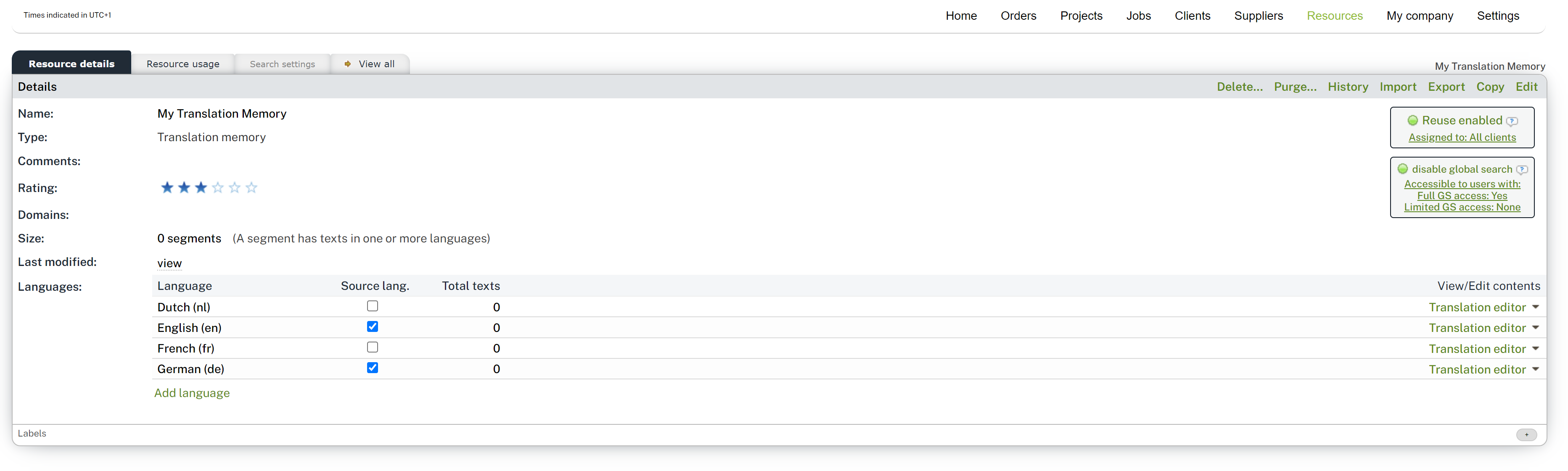 Click on Add new (at the upper right of the Translation memories page, the Project memories page, the Terminology page or the All page) or point to Resources on the menu bar and click on Add new.