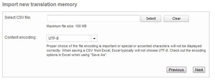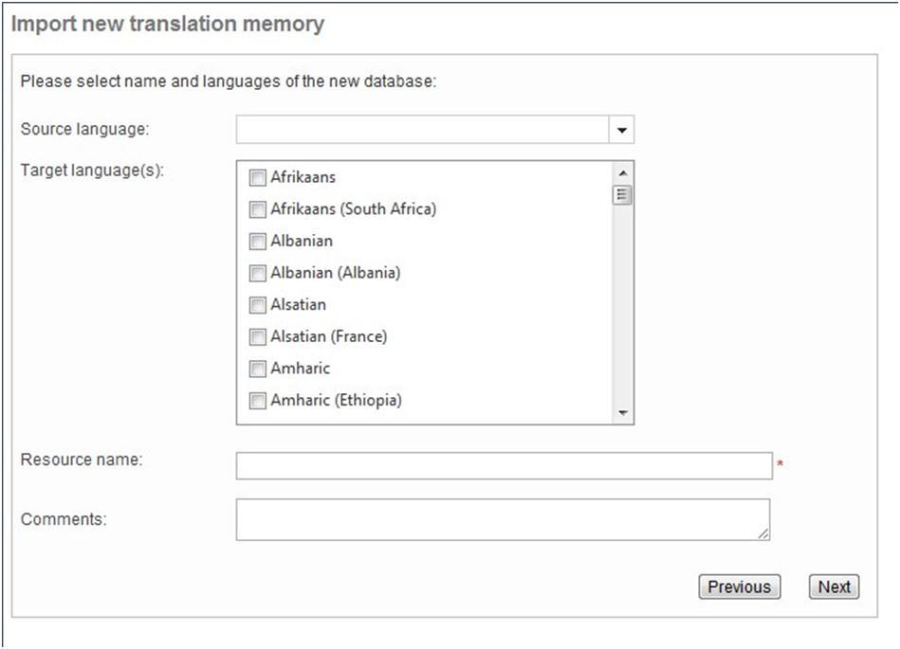 Choose the source and target languages and provide a name for the translation memory. You can also leave a note to describe the type of content to be imported.