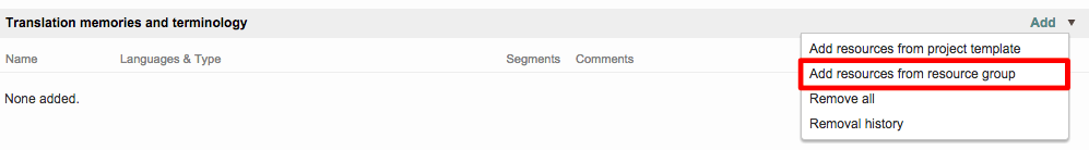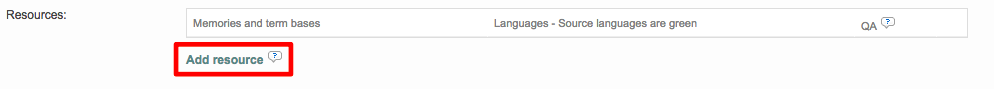 Next, you will need to add your resources to the group. This can be any combination of translation memories and terminology databases in the system. You may also assign more than one of each to the group. To begin, click on Add Resource.