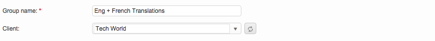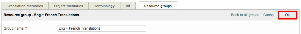The first step will be to enter a name for the resource group. To do so, click on the text field shows New Group and then type a name for your new resource group. In the example below, the resource has been given the name "Eng + French Translations".