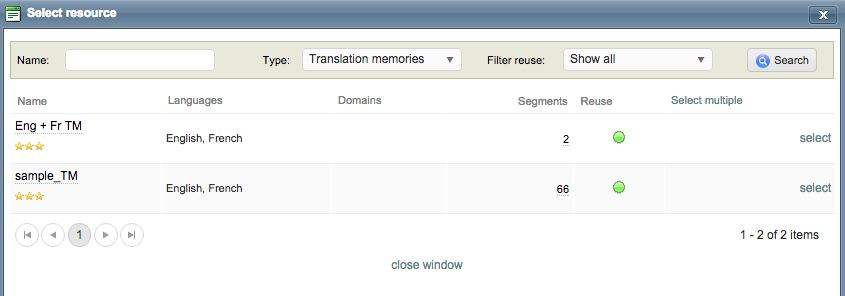 You may search for resources by name, type (translation memory or terminology database) and configure a filter if desired to locate specific resources. The Search Feature is beneficial when many linguistic resources exist within the system.