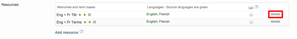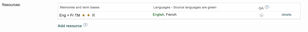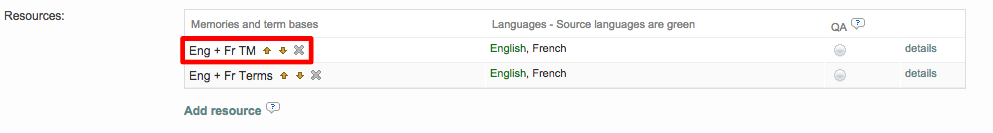 Note that you can set up an order for your resources so that the first in the list has the top priority, after the Project Memory. This functionality will be useful when there is a need to differentiate or set priorities between segment matches to show some common attributes (same % score, status, language specificity, etc). Learn more about search and pre-translation criteria in the FAQ page.