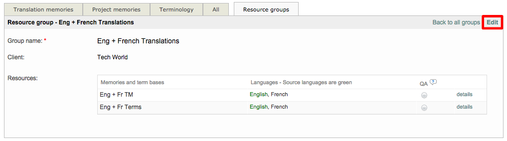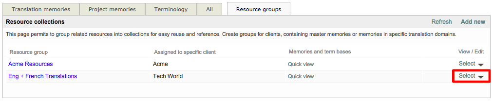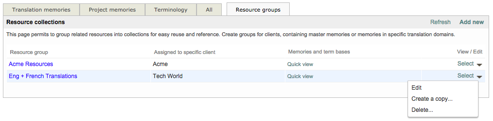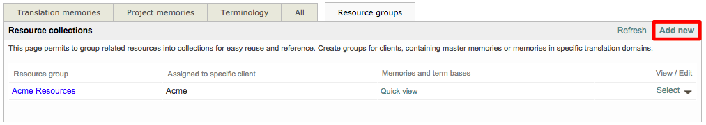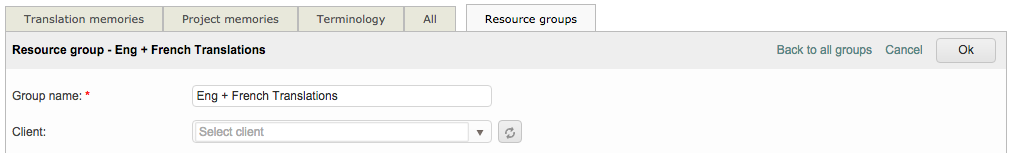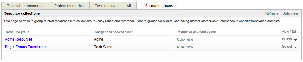 Once at least one Translation Memory and Terminology Database exist within the system, you can then create a resource group for these items. This is much easier than manually selecting each linguistic resource to be used for a client or project in the system. Resource groups may be created per translation domain, per client, or per product, for instance.The idea is that whenever you create a translation project for a specific domain/client/product you simply have to select the related resource group and the document(s) to translate will be automatically pre-translated from the right resources.
