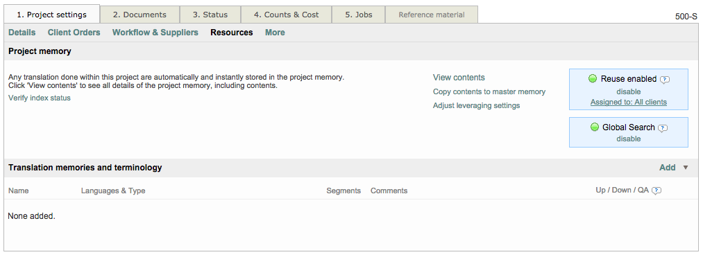 Once the project memory that you will be building during your project starts being filled, it will be considered by default as first the first reference for pretranslation or propagation of contents. You can disable this behaviour in the dedicated page for the resource or globally for any Project Memory