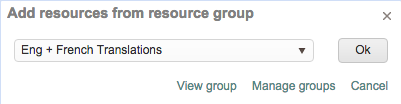 Then select the desired resource group from the drop-down menu and click on OK to add these items to the project. Every resource in the chosen group will be added to the project and used for translations, etc.