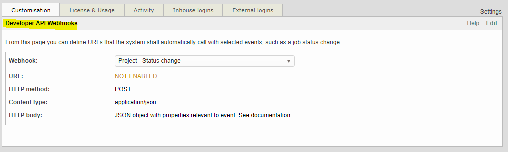 In Settings > Developer API Webhooks, use the Edit link to define the URLs of the events Wordbee Translator will automatically trigger. Fill in the properties as follows: