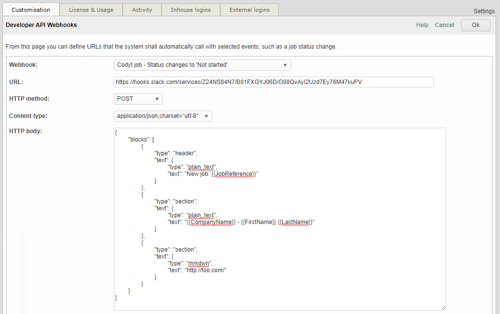Webhook: Choose “Codyt job - Status change to Not started”. This will notify new jobs.