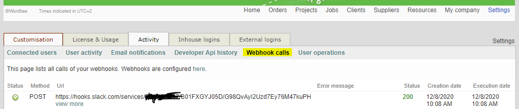 We will now set up “webhooks” in your Wordbee Translator platform. A webhook is nothing more than a URL that Wordbee calls when an event, such as job status, changes. The URL that Wordbee will call is the exact URL that you created when configuring Slack.