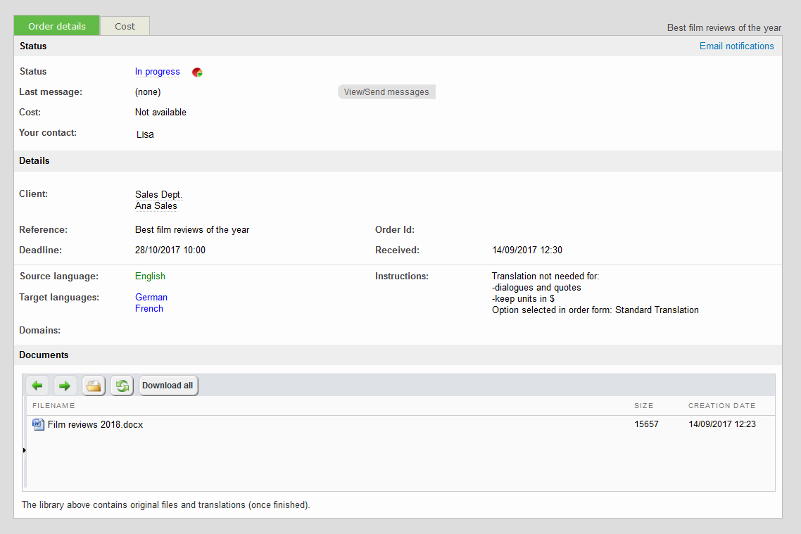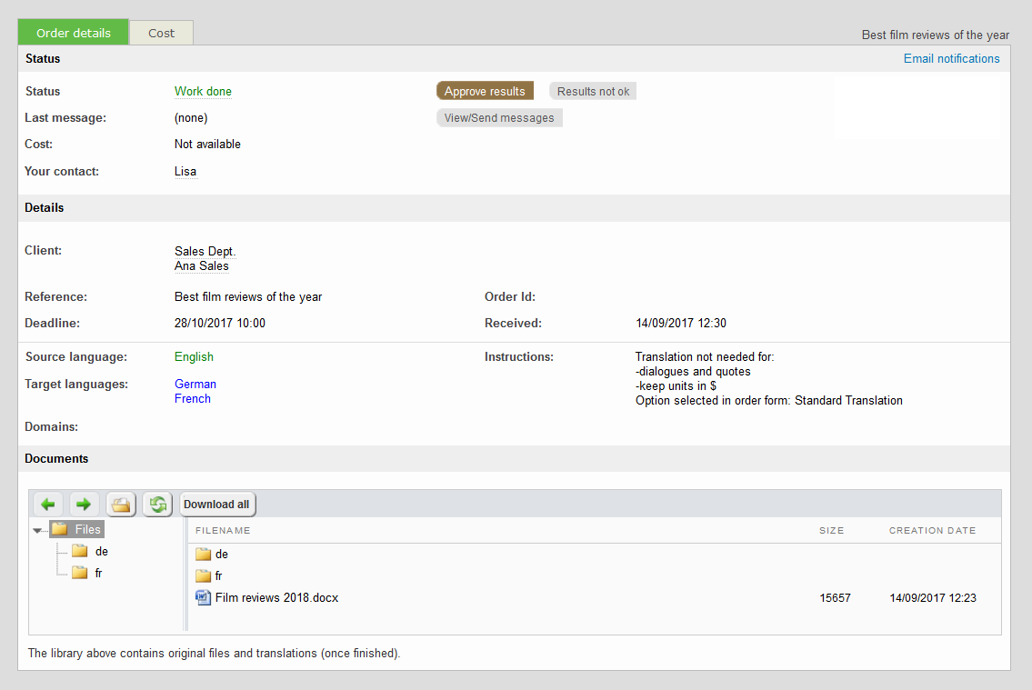 Once all final files are ready, the status of your order will change to Work done, and you will be automatically notified to retrieve all the translated files.