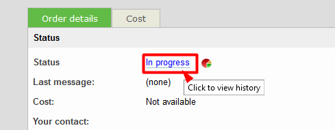 Track the progress of your order by checking the Status. You can also view the entire history by clicking on the status link.