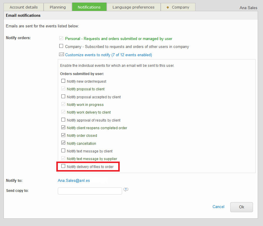 Notify somebody from your own company anytime there are updates to be checked using the Email notifications link.
