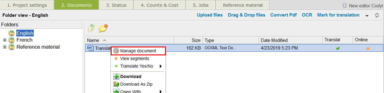 Right-click on the document(s) that needs to be translated.