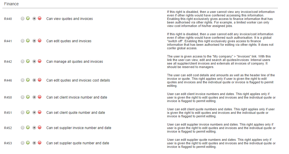 Step 6: Disable all finance rights (namely R440 - R442 if you don't want to have the dedicated dashboards displayed the next time these users access the platform). All changes will apply the next time users start their session in the system.