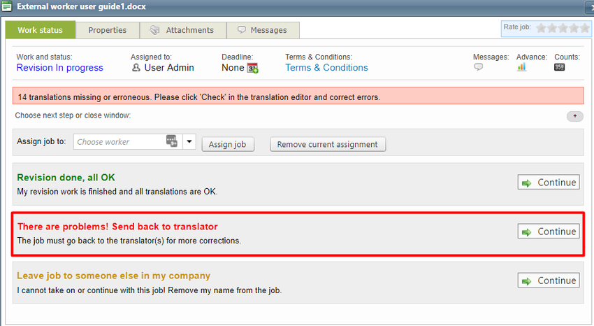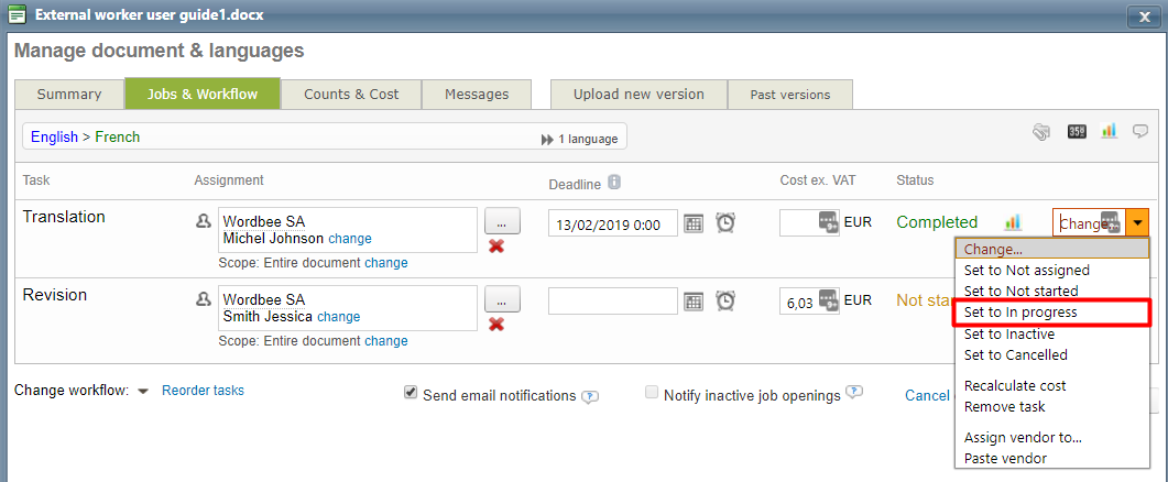 Just update the status of the job you want to modify by selecting In progress or Not started to make the task available again to the vendor. By default, a notification will be triggered to the interested users.
