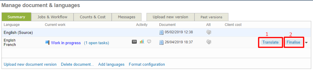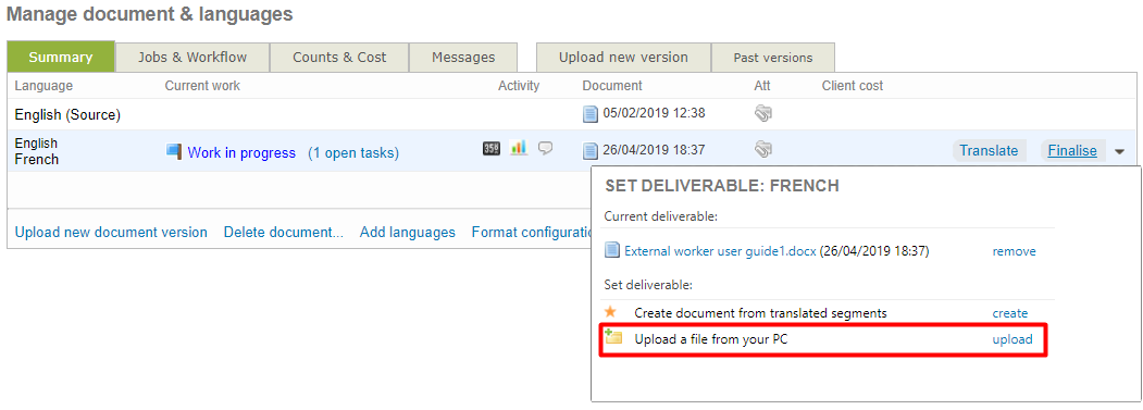 Then, click the "Finalise" button in the language pair of your choice. You can find here the current deliverable that you can download and possibly modify the layout offline. Once you the have right layout, just upload the file and the previous deliverable will be replaced by your new version.