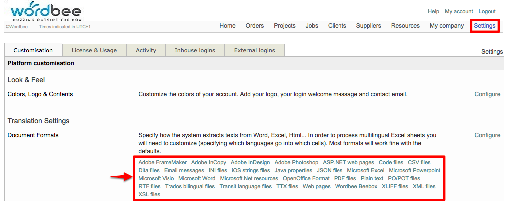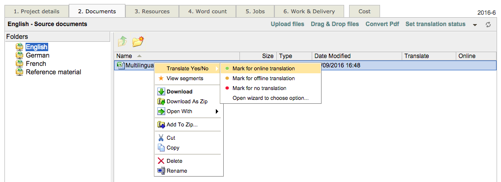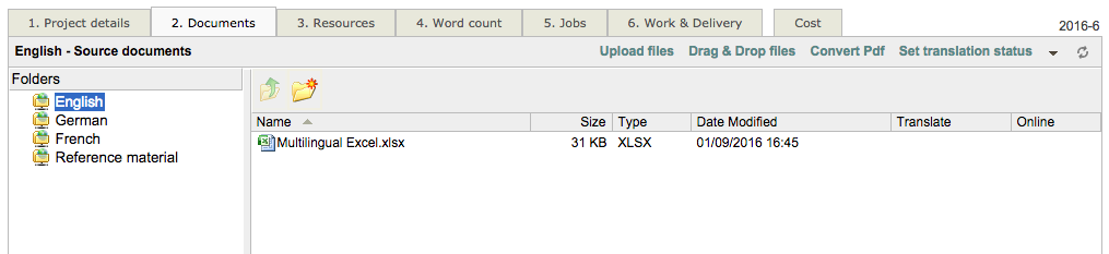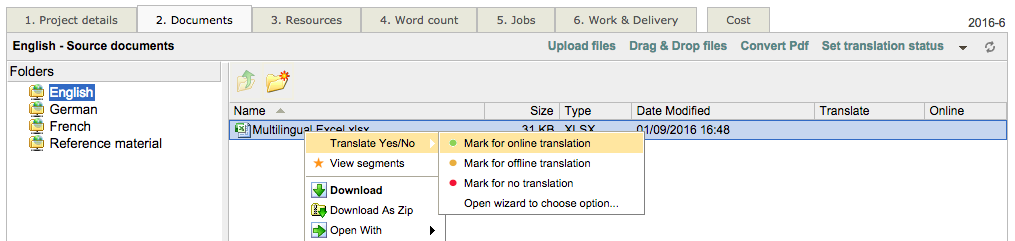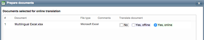 Once the document has been uploaded, you will be able to mark it for online translation and select the created Excel file format configuration.