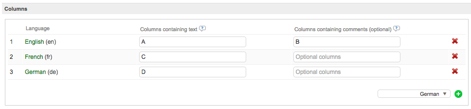When adding the languages, you must also enter the column for each language in the configuration. Text columns (language columns) are on the left and comment columns are on the right of the column section. Click a field and type in the column value as it appears in the Excel source file.