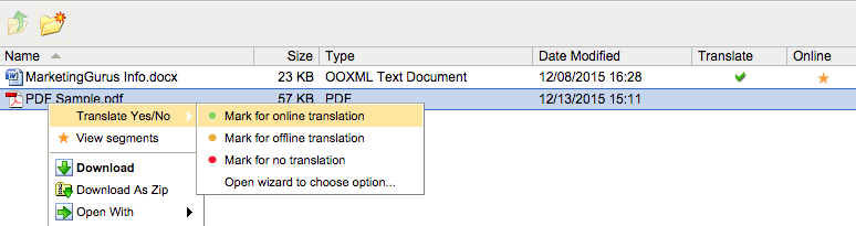 Choose Translate Yes/No in the drop-down menu and select Mark for Online Translation.