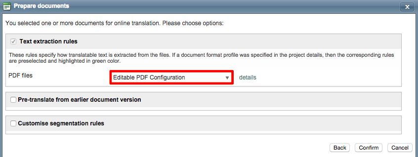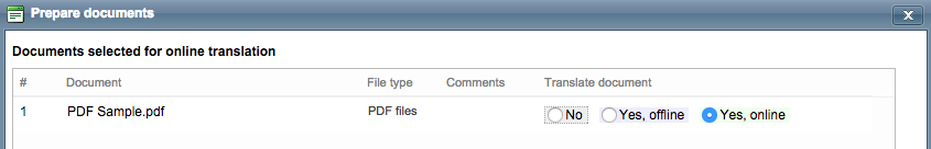 When you mark a document for online translation (Standard and CoDyt projects), you have the option to select a file format configuration. This is where the PDF format configuration created above will be applied in the system.