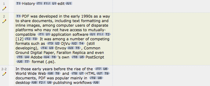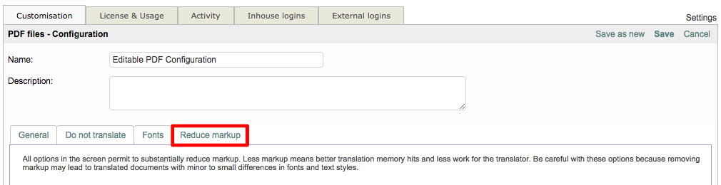Often the markup in these documents is overbearing because formatting tags frequently appear between letters and in a number of locations throughout the document. A PDF Format Configuration may be used to remove unnecessary markup and tags to make it easier to work on the PDF.