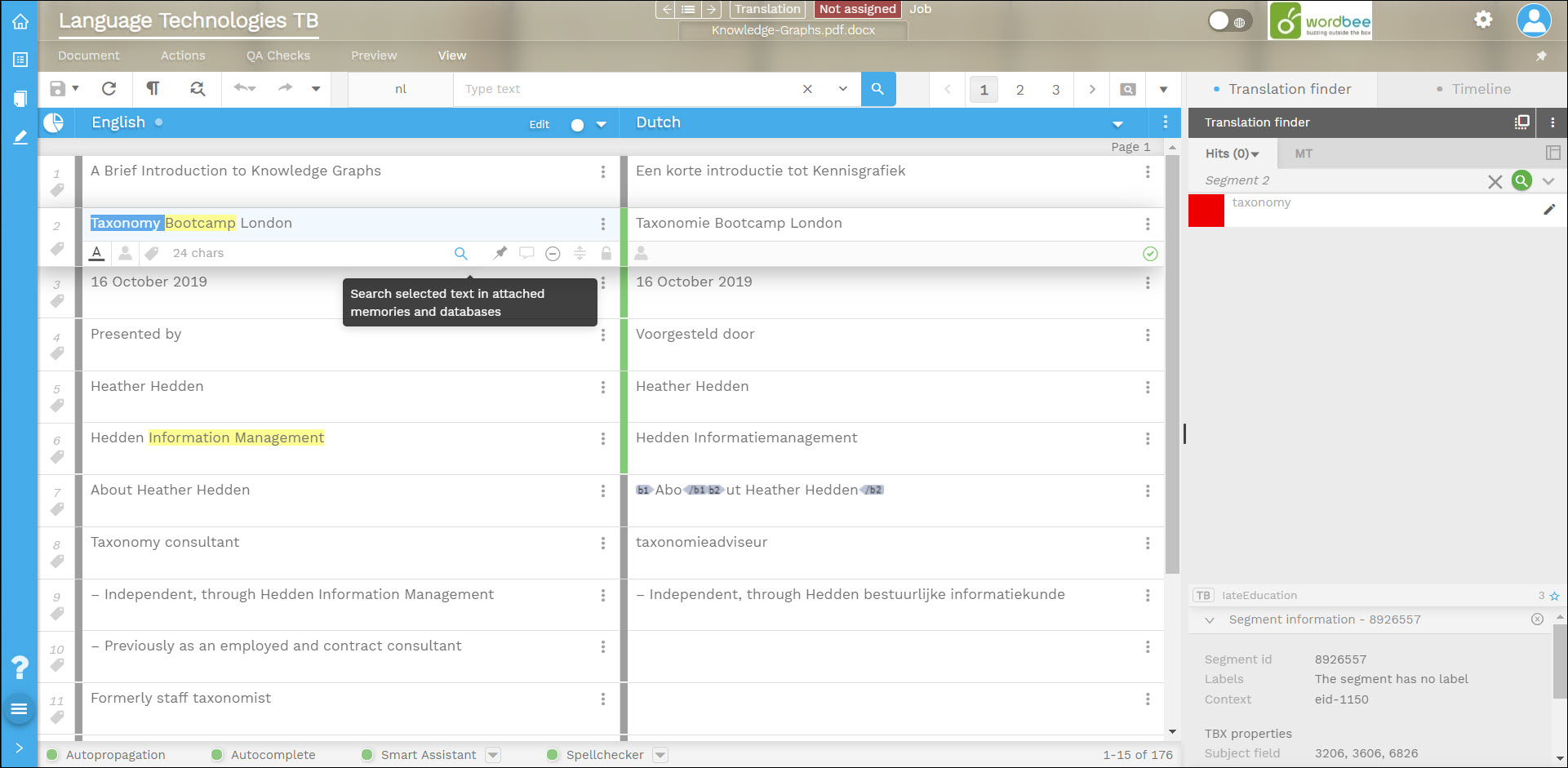 If a term is not automatically highlighted by the system, you can select it and look it up in the terminology databases attached to the project.