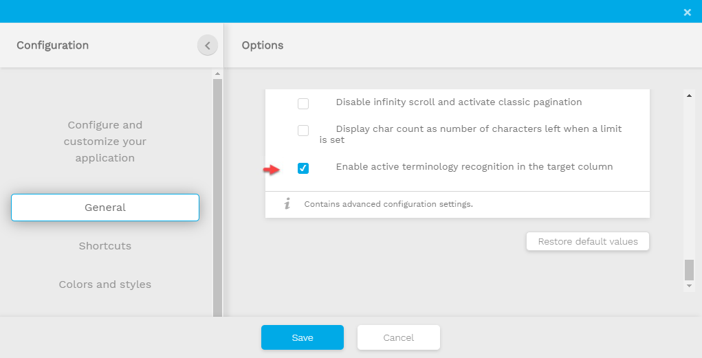 Highlighting of the exact term matches in the Source text is enabled by default. To use the feature in the target segments, you first need to enable it in the Translation Editor Settings. Note that the feature may have an impact on the performance of the system.