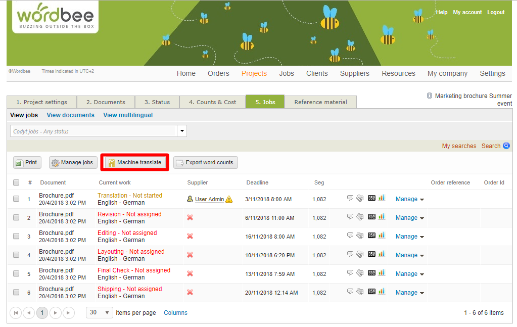 Enable the MT access rights for your in-house staff so that they can use MT to translate full documents directly from the Jobs dashboard.