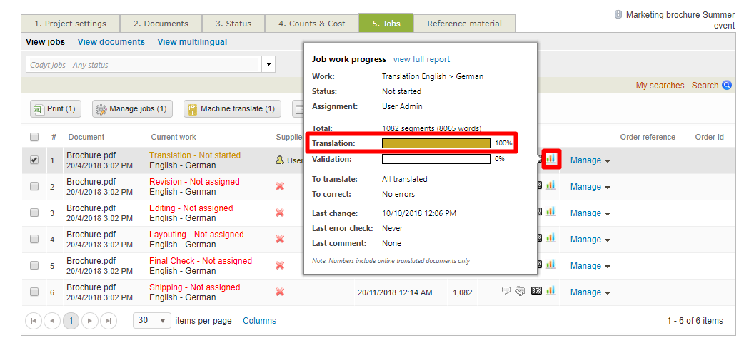The work progress icon next to your job will show the % the document completed via MT translation in the translation bar.