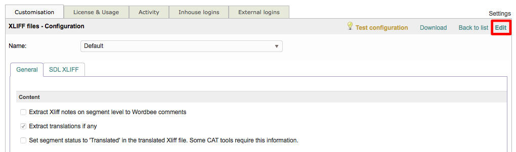 Step 1: Click on Edit to change the XLIFF configuration. If only the Default configuration is present for XLIFF files, simply edit it and then Save as New when finished.