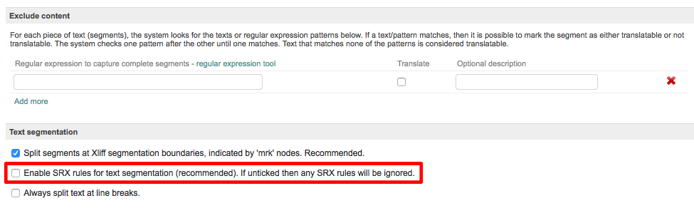 If you need to process XLIFF files containing existing translations, then the Enable SRX Rules for Text Segmentation option must be disabled (unchecked) in the XLIFF file configuration.