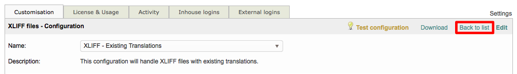 Step 4: Click on Back to list in the upper right corner to return to a list of existing XLIFF configurations. If it is a new configuration, its name will now appear in this list.