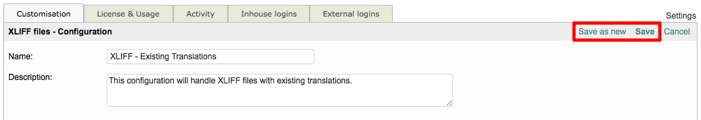 Step 3: Next, save the change to the chosen XLIFF configuration. If you are editing a configuration other than the Default, simply click on Save. Otherwise, enter a Name and Description for the new configuration and then click on Save as new in the upper right corner of the screen.