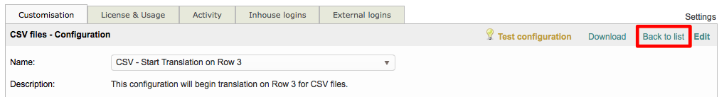 Step 5: To view the list of CSV configurations, click on Back to list in the top right of the screen.