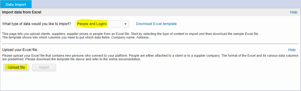 Go back to the "import data" screen, select "People and Logins" in the dropdown menu, and click on the "Upload file" button, as shown below: