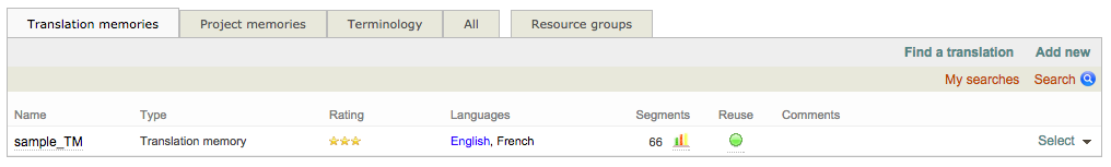 To view the translation memories already available in the system, click on Resources and open the Translation memories tab: