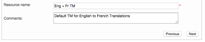 A name must also be entered for the translation memory. To do so, click on the Resource Name field and type in a relevant name. This could be a combination of the client, product, languages, etc. An additional section is provided to add Comments for further reference. When finished, click on Next.