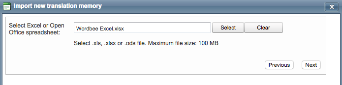 Wordbee Translator supports multiple translation memory file formats: TMX, Excel, CSV, Open Office Calc, Align Assist Files, and TBX. You will need to select the appropriate file format in order to continue. Please note that the format must match the file chosen for import in Step 3.
