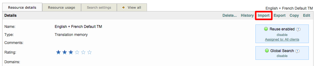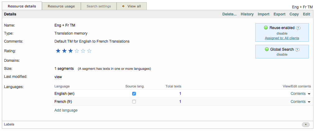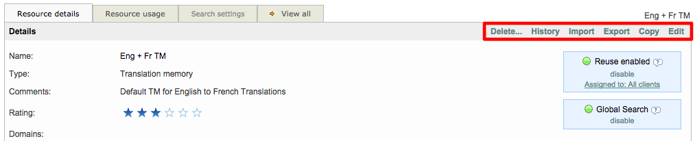 Once you have imported the translation memory, many more actions can be taken and are displayed at the top of the Resource Details Tab. You may delete, copy, or edit the TM as well as View its history or export it to your computer.