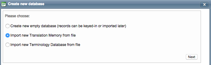 If you are importing a translation memory that will not be part of an existing one in the system, then you will need to first pick the resource for the import. Tick the radial next to Import new Translation Memory from file option (if not chosen already). Then click on Next.