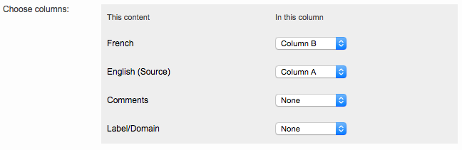 Next, select the corresponding column for the source language, each target language, comments, etc in the import file. To do so, click on the drop-down menu and choose the appropriate column for each item. In the example below, English (Source) is Column A and French (Target) is Column B.