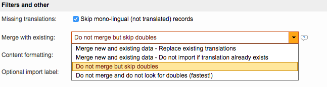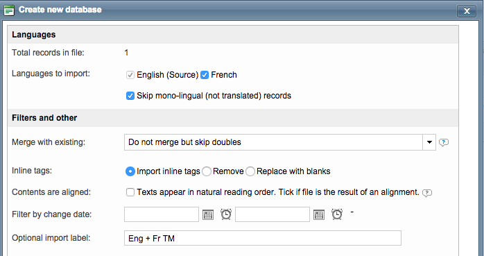However, if the translation memory has been previously imported or is being imported into another translation memory, the Merge new and existing data options are appropriate.
