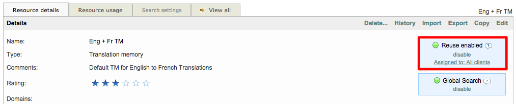 The Reuse feature is enabled by default for all clients and allows the translation memory to be used again in the system for a specific client or all clients. If a translation memory is reusable, it will have a green circle when viewing translation memories in the system resources.
